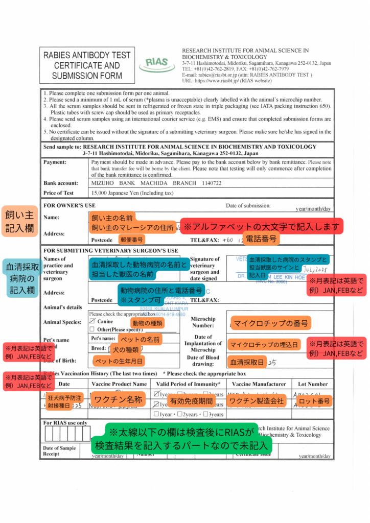 日本語版と英語版があります。マレーシアの獣医さんに記入してもらう箇所があるので、私は英語版を2通(2通まで同料金)準備しました。