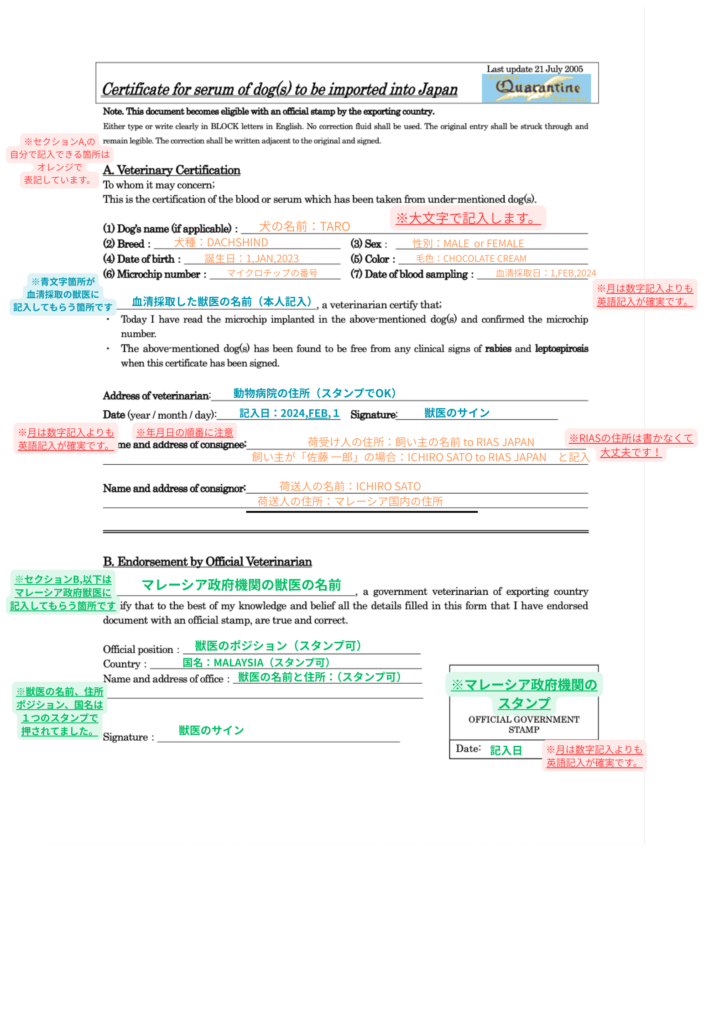 「日本へ輸入される犬の血清に関する証明書」の書き方の注意と記入例